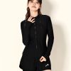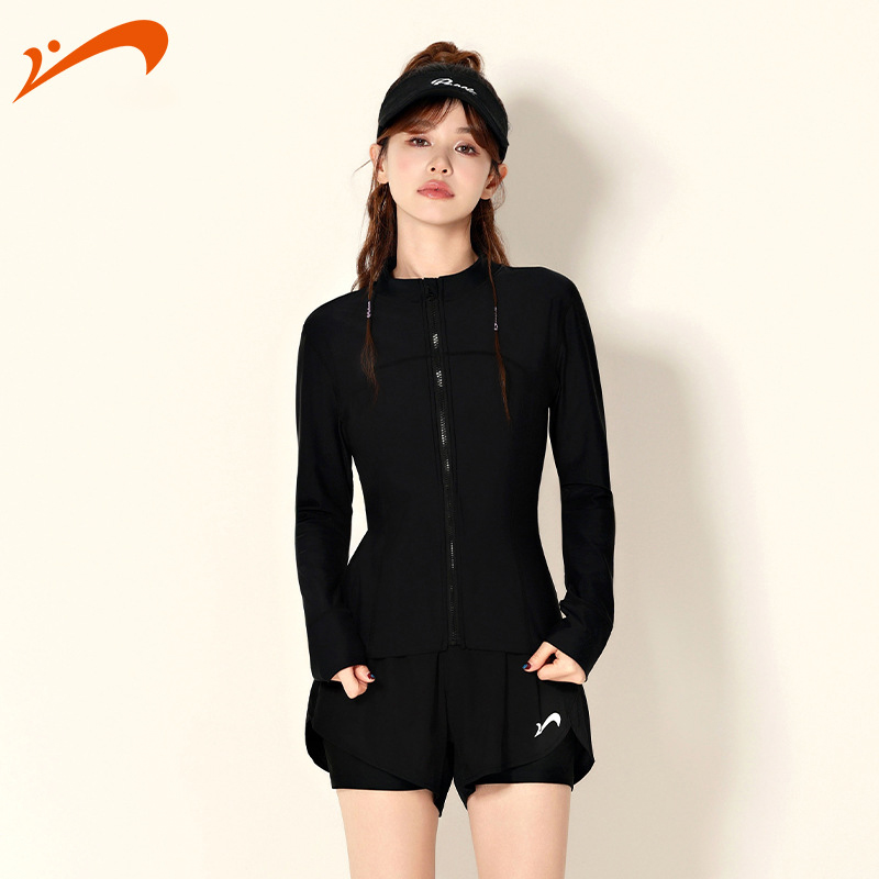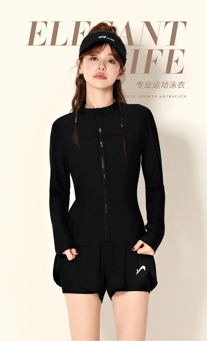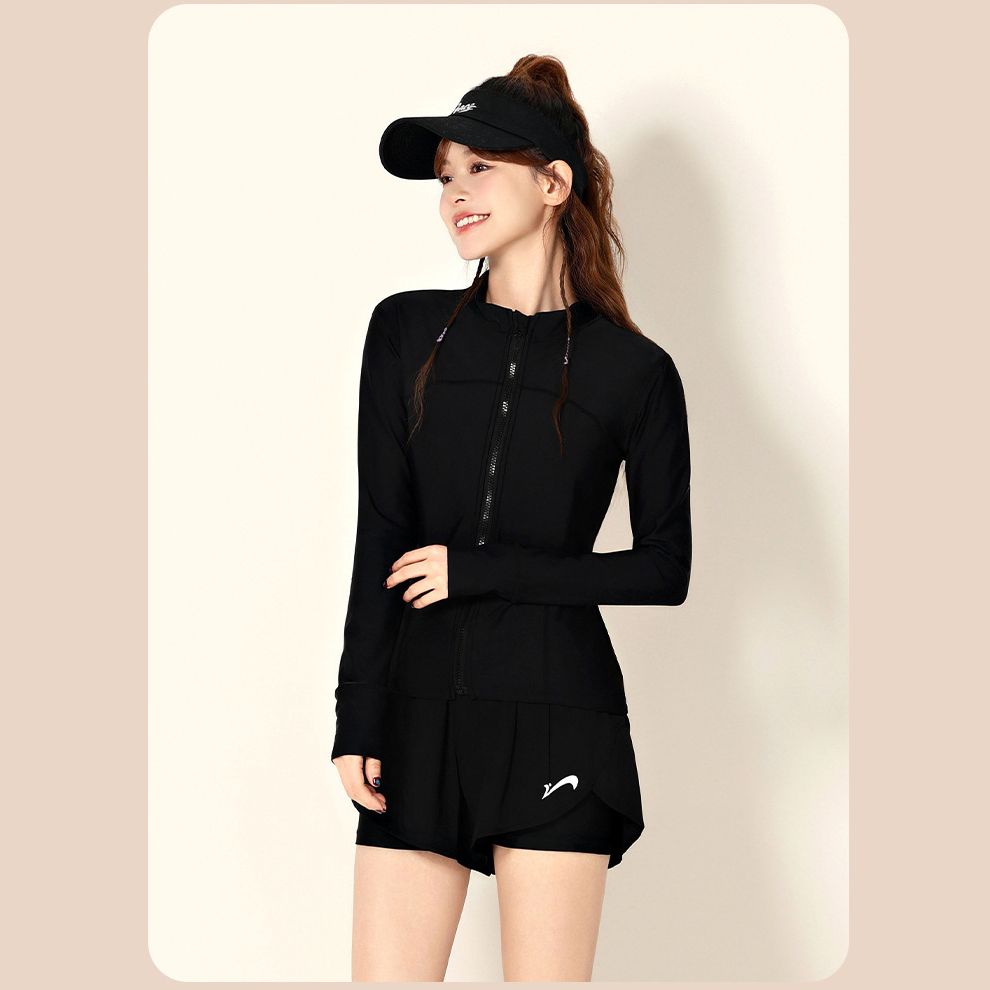 Bộ bơi dài tay khóa kéo nữ quần đùi 2 ống kín đáo – Đen