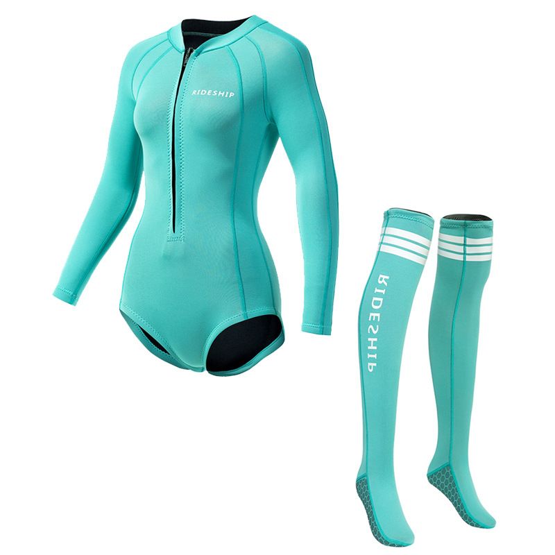 Bộ Bơi Giữ Nhiệt Nữ Dày 2.0mm Liền Thân Dài Tay Kèm Tất Lặn Dài – Xanh