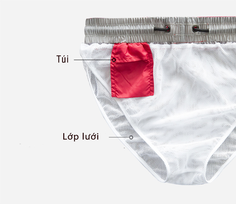 Quần bơi biển cho nam mau khô, có túi, có 2 lớp, một lớp lưới chống nóng