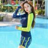 Set Áo Bơi Nữ Dài Tay Chui Đầu Áo Xanh Quần Đùi Xanh Hoa